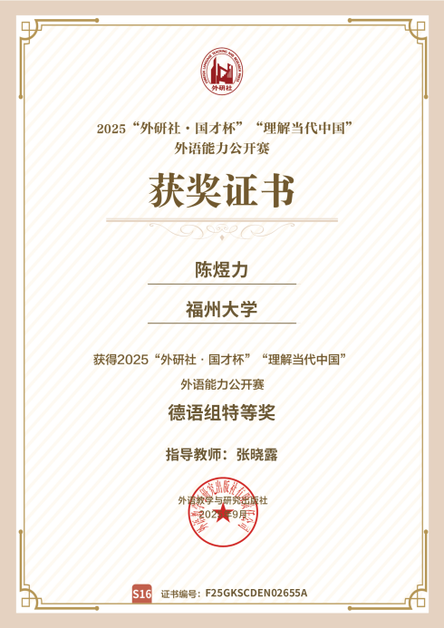 外国语学院长期以来将竞赛作为提升学生综合素养的抓手,尤其注重语言、思辨与跨文化能力的融合培养,成果斐然。“外研社·国才杯”“理解当代中国” 外语能力公开赛是这一理念与实践的生动实践,在比赛中,德语系学子扎实的学科知识与应用能力体现了我院在教学中对学生语言能力和思想视野的重视,学院将持续发力,将提升学生全球胜任力作为培养目标,继续深化教育教学改革,致力于让学生在更高水平的竞赛中磨砺成长,提升专业底蕴与思维格局,为学校“双一流”建设和国际化人才培养注入新动能。