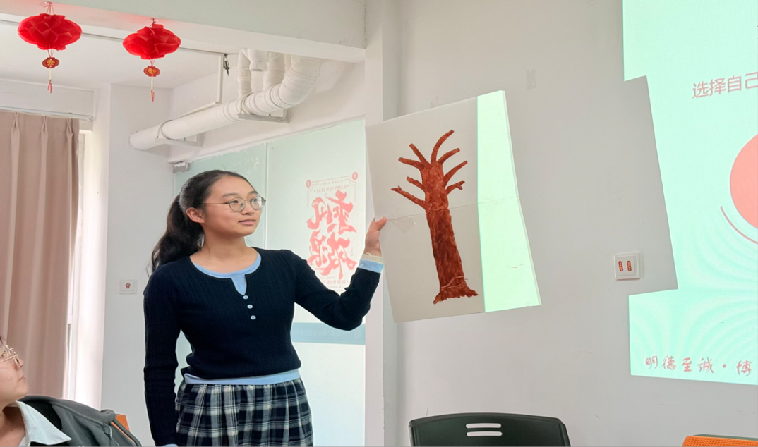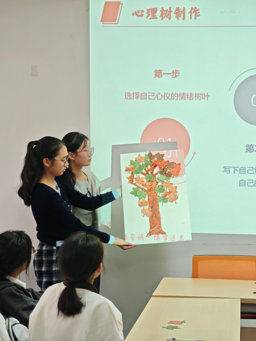 将压抑的恐惧与烦躁转移到情绪树叶,相当于给内心的情绪高压锅拧松了阀门,降低负面情绪的强度,放松身心,同学们共同完成了属于5班的心理树,独一无二,不可或缺。
