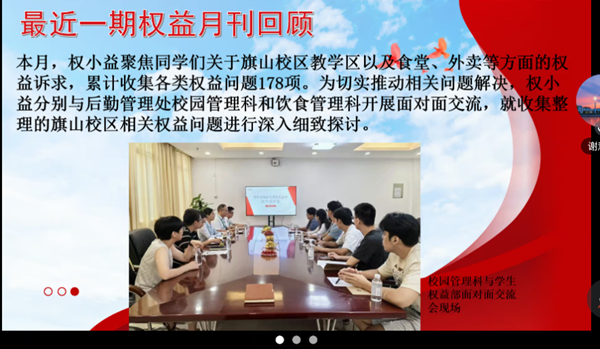本次会议共有三个环节:包括对前期工作的总结、对本月收到权益问题的具体回应以及参会同学现场反馈。会议中显示本月的权益问题大致集中于食堂用餐、熄灯时间、平整路面等方面。