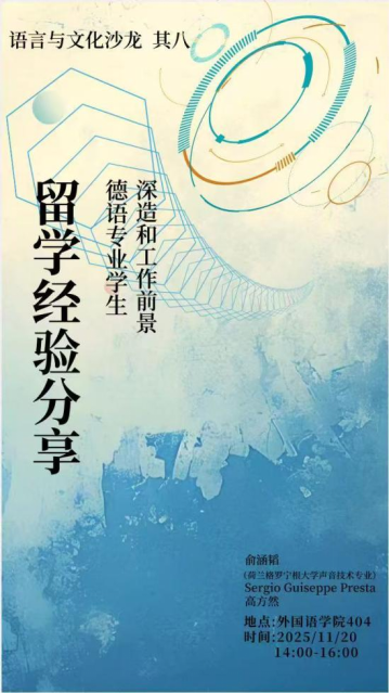为帮助德语专业学生明晰深造与就业方向,福州大学学生德国印象协会于2025年11月20日14:00-16:00,在外国语学院404教室举办“德语专业学生深造和工作前景”留学经验分享会。本次活动邀请20级校友俞涵韬、德语系外教Guiseppe Sergio Presta、讲师高方然担任分享嘉宾。