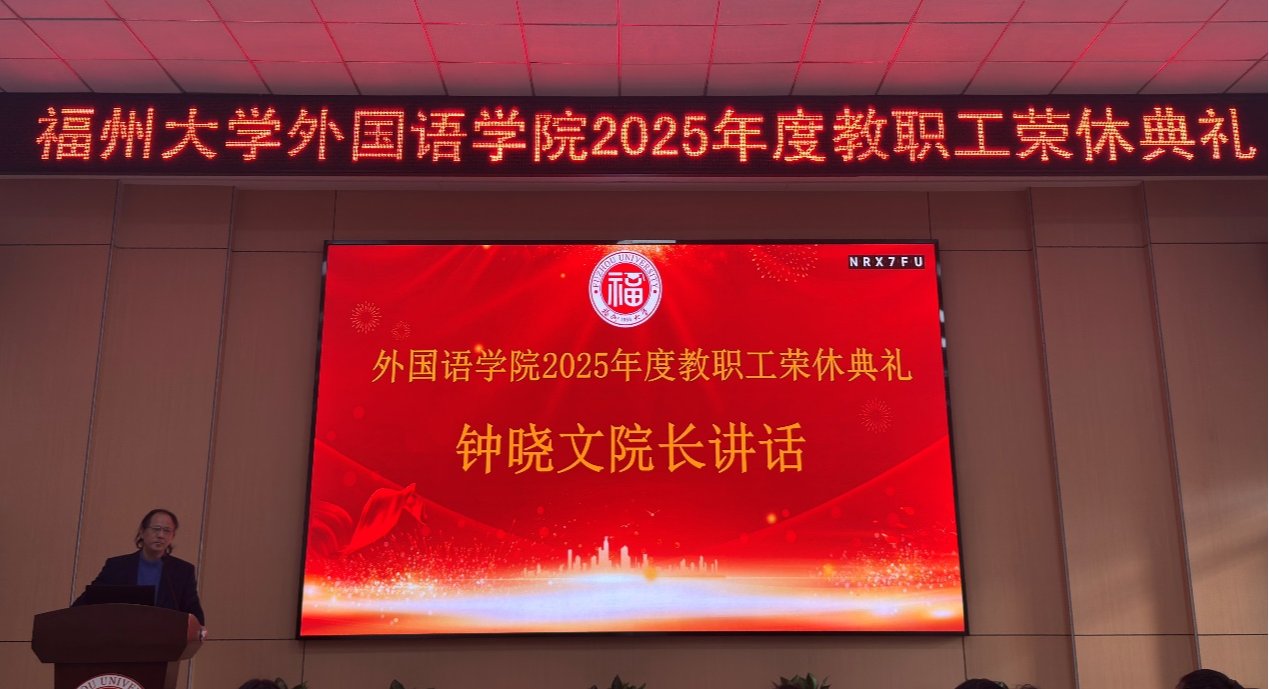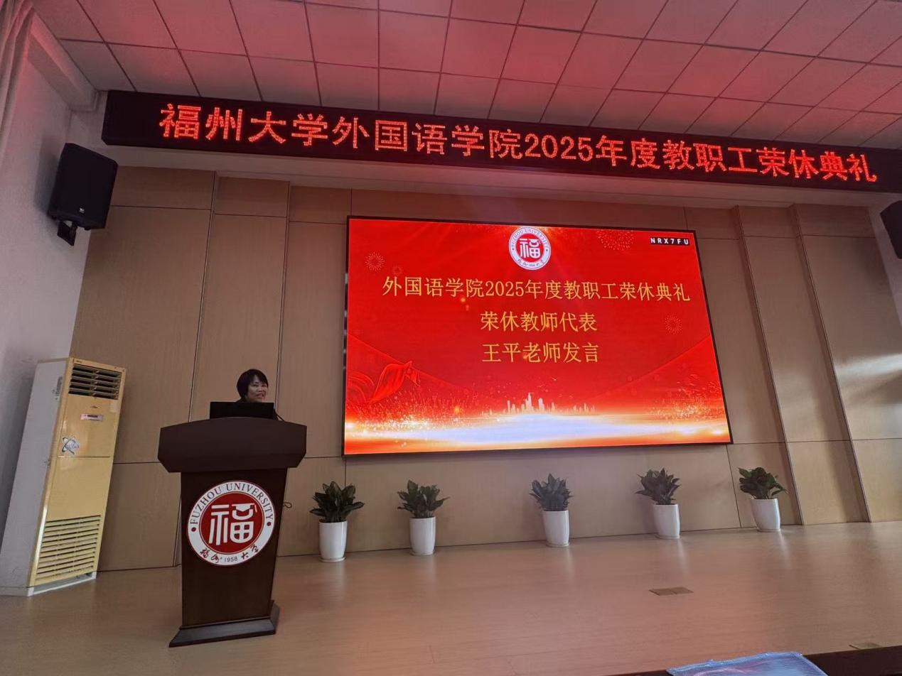 岁月如歌,致敬芳华。2026年1月13日下午,福州大学外国语学院2025年度教职工荣休典礼在学院三楼报告厅温情启幕。学院领导程贞玫、钟晓文、徐红梅、林继红,全体教职工及学生代表齐聚一堂,与王平、王冰、杨植等荣休教师代表温情相聚,向荣休教师为学院发展倾注心血、奉献韶华的教育前辈致以最真切的敬意。
