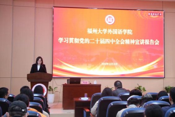 为深入学习宣传贯彻党的二十届四中全会精神,近日,福州大学外国语学院在学院三楼学术报告厅举行党的二十届四中全会精神宣讲报告会。报告会特邀福州大学学习贯彻党的二十届四中全会精神专家宣讲团成员、社科处处长、经济与管理学院教授卢长宝担任主讲人。学院领导程贞玫、徐红梅、林继红,以及师生代表近150人参会。学院党委书记程贞玫主持会议。